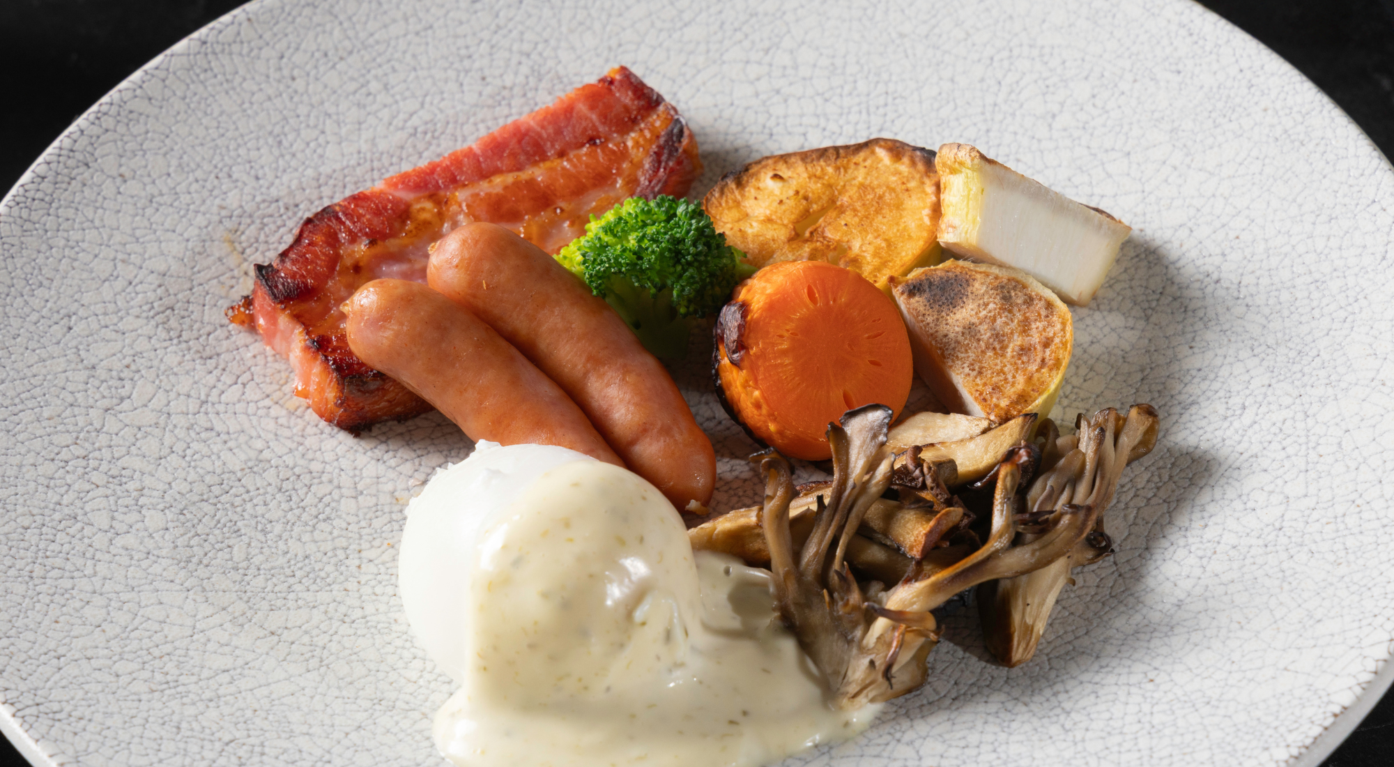 Enjoy a luxurious morning plate with local vegetables and fruits, fluffy bread, house-made spreads, and more — a delightful way to begin your day.