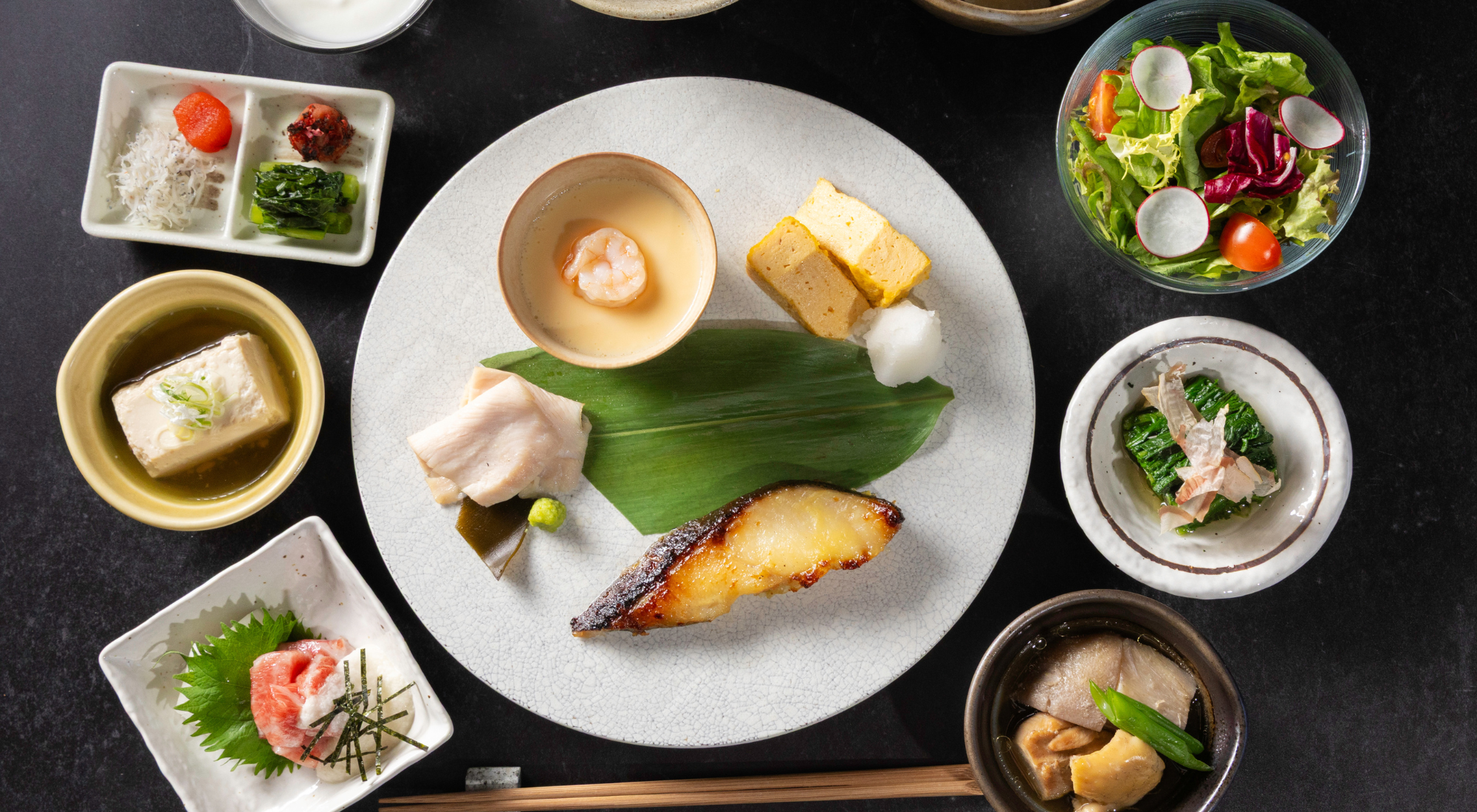 A traditional Japanese breakfast featuring an abundance of fresh local ingredients and seasonal flavors.