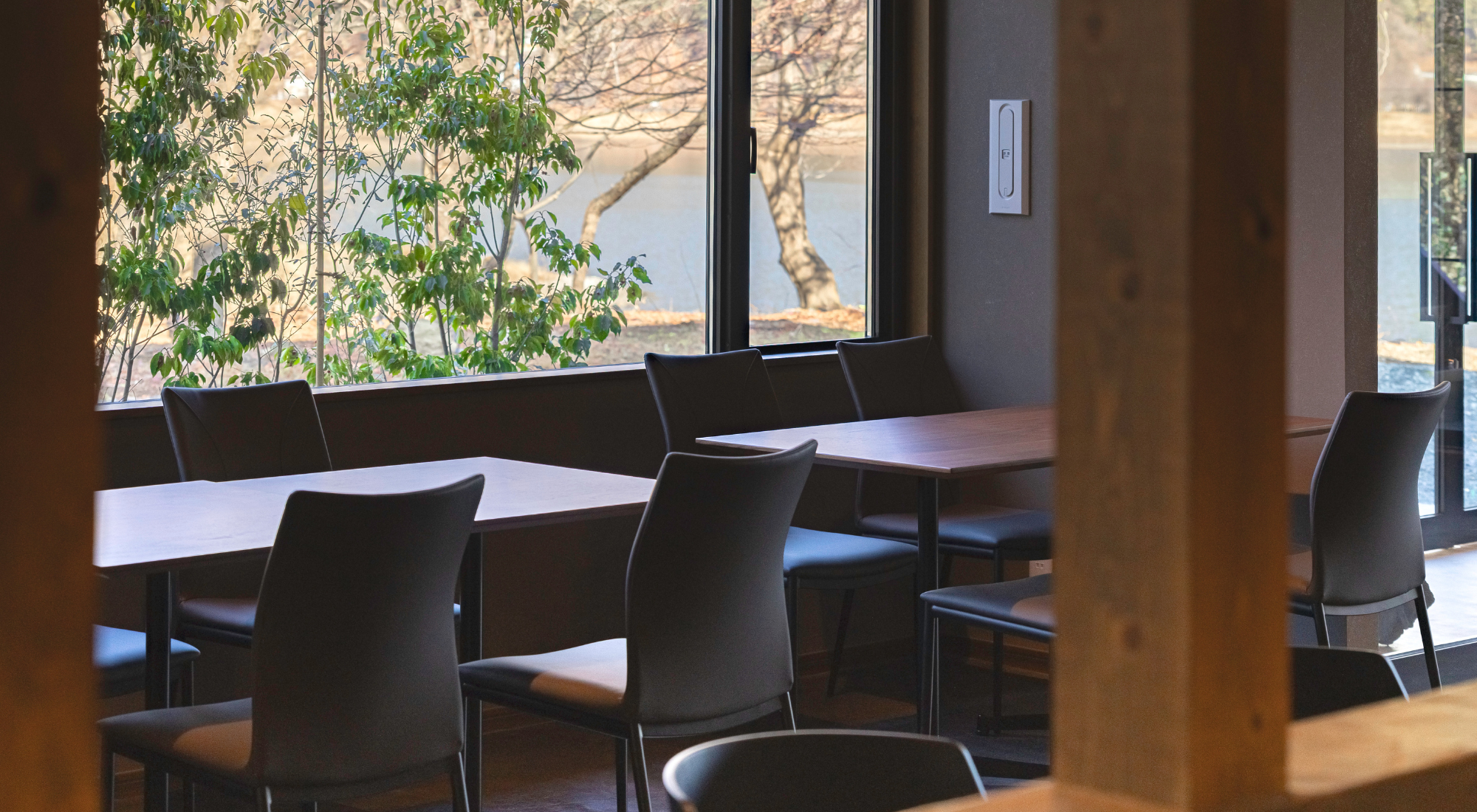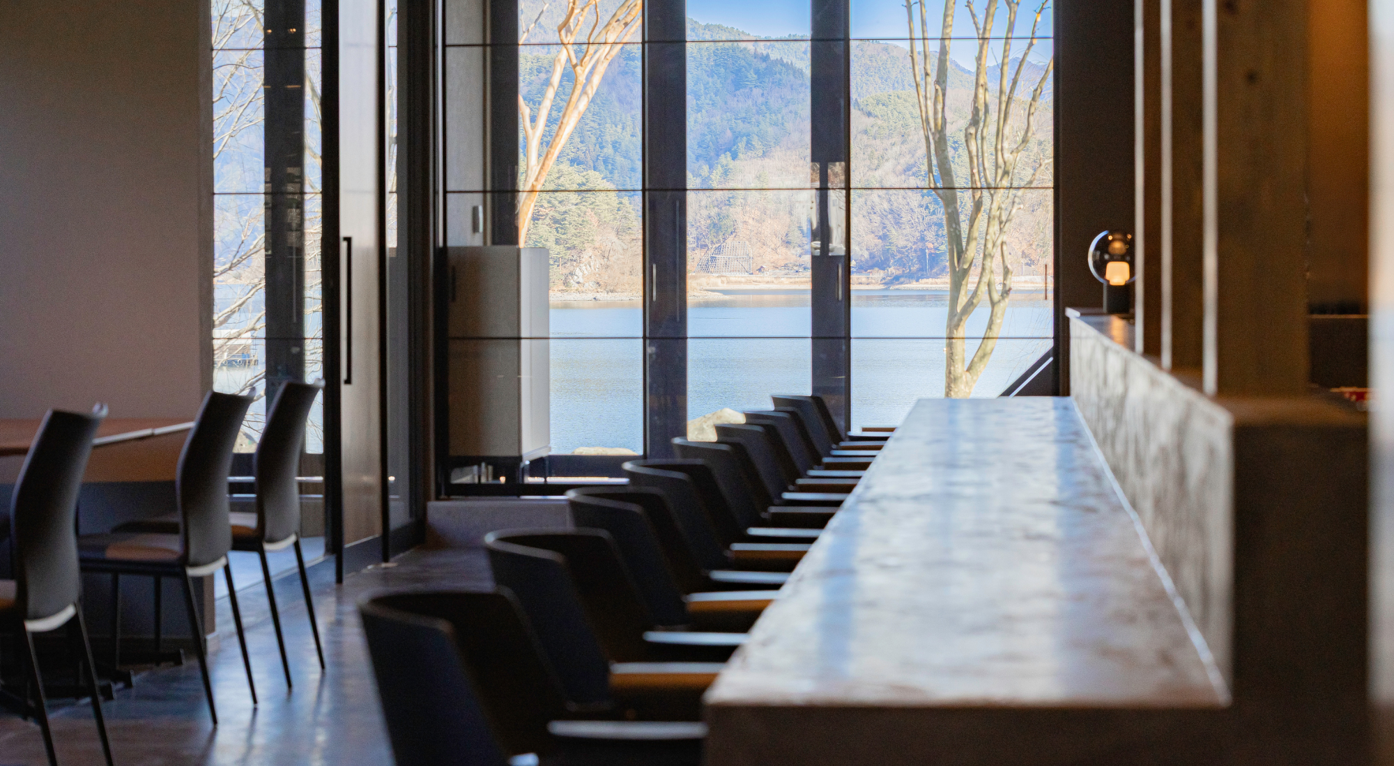 In the evening, counter seating is available for BAR time, as well as round tables overlooking Lake Kawaguchi through glass windows.